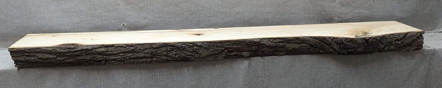 Dark brown thick bark on face that shows machine scars and slight moss. Light brown and gray color on top and bottom that shows knots, splits, and bark seams.