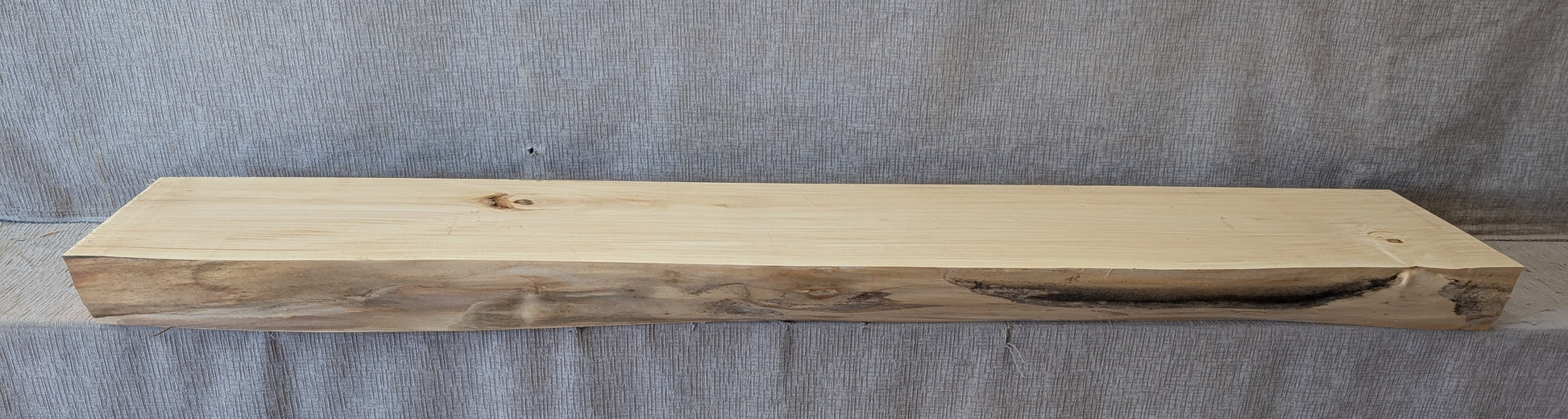 Mixed light brown and gray color on irregular shaped face which shows machine scars. Mixed light brown and gray color on top and bottom with knots, splits, and bark seams.