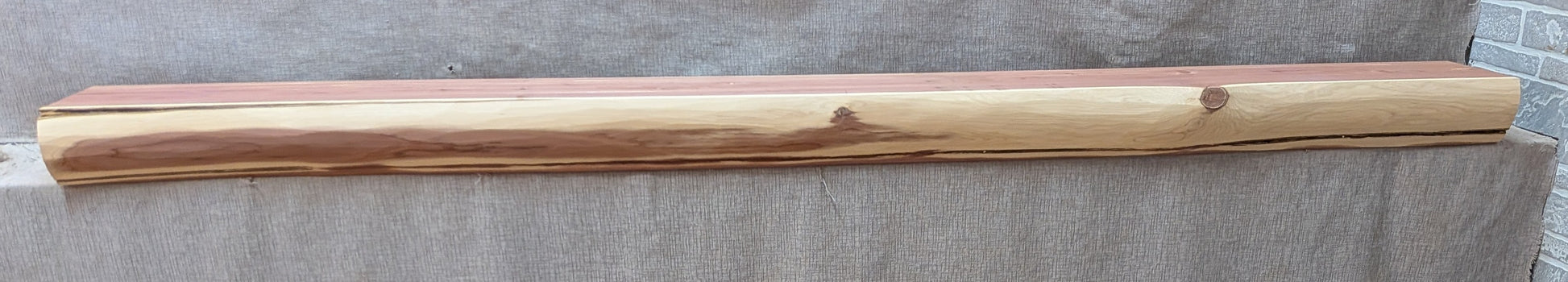Mixed brown colors on regular shaped face which shows knots, splits, and bark seams. Mixed red and white color on top and bottom with knots and splits.