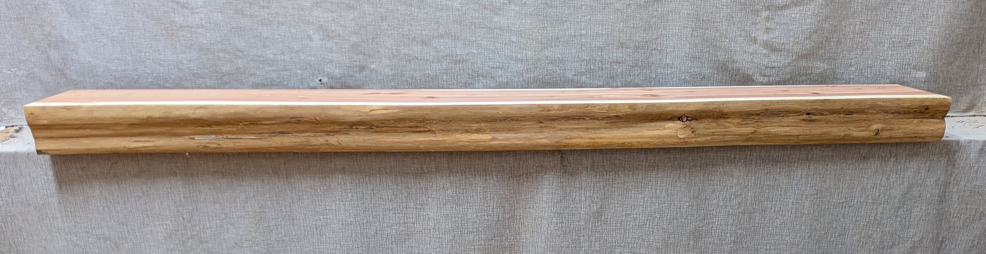 Mixed brown colors on regular shaped face which shows bark remnants and cut off branches. Mixed red and white color on top and bottom with knots and splits.