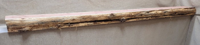 Mixed brown colors on regular shaped face which shows bark remnants, wormy character, machine scars, bark seam, and branch tips. Mixed red and white color on top and bottom with knots and splits.