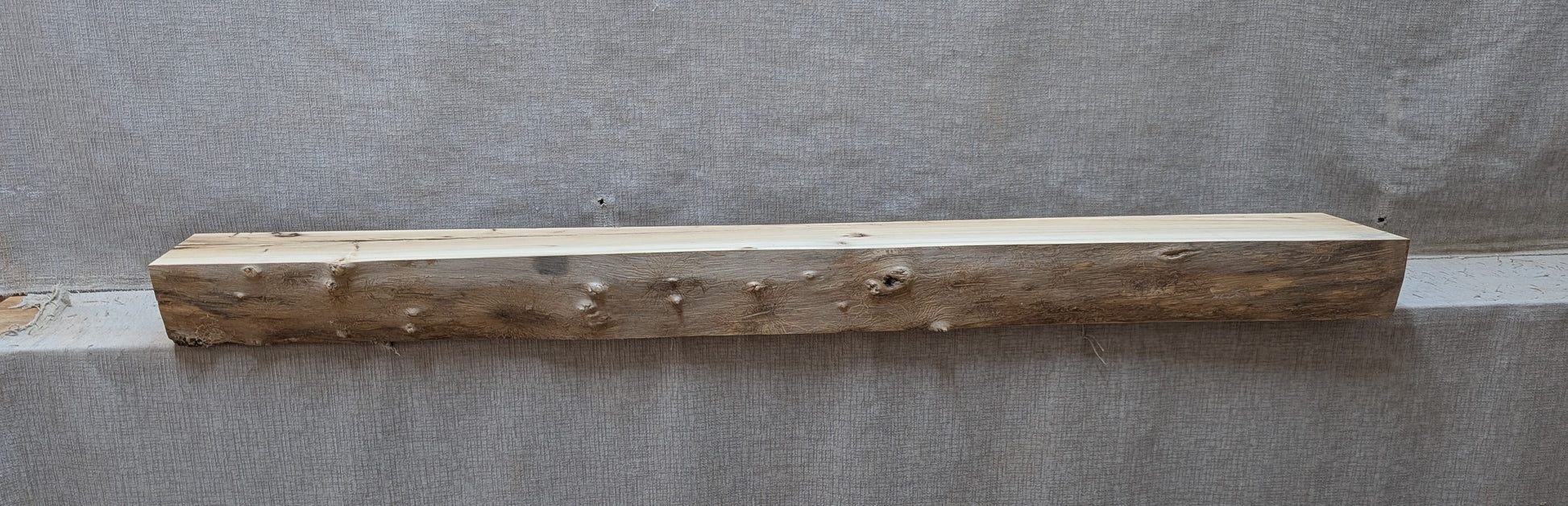 Mixed light brown and gray color on face which shows branch tips, and wormy character. Mixed light brown and yellow color on top and bottom with knots, splits, wormy character, and bark seams.