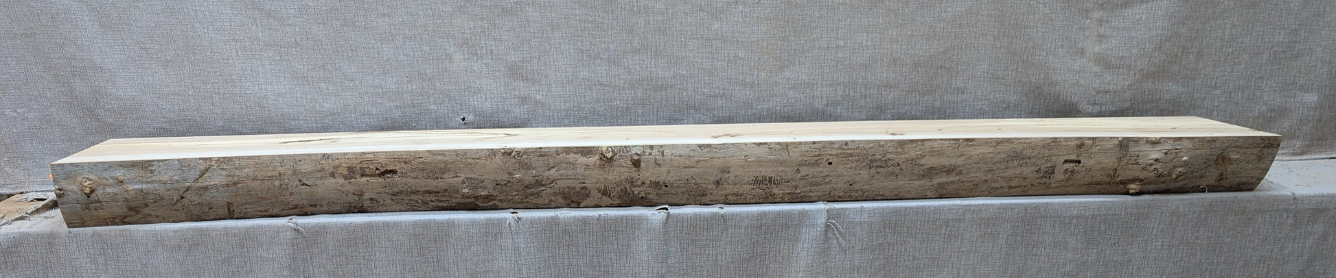 Mixed light brown and gray color on face which shows splits, machine scars, branch tips, and wormy character. Mixed light brown and yellow color on top and bottom with knots, splits, and bark seams.