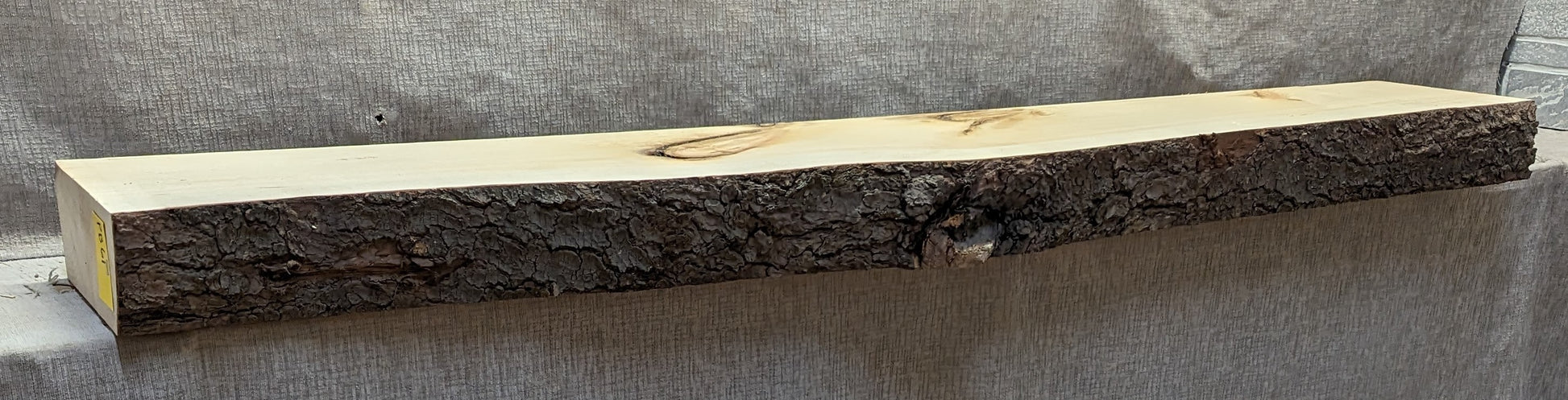 Dark brown thick bark on face that shows large knot and machine scars, light moss, and cut off branch. Light brown and gray color on top and bottom that shows knots, splits, and bark seams.