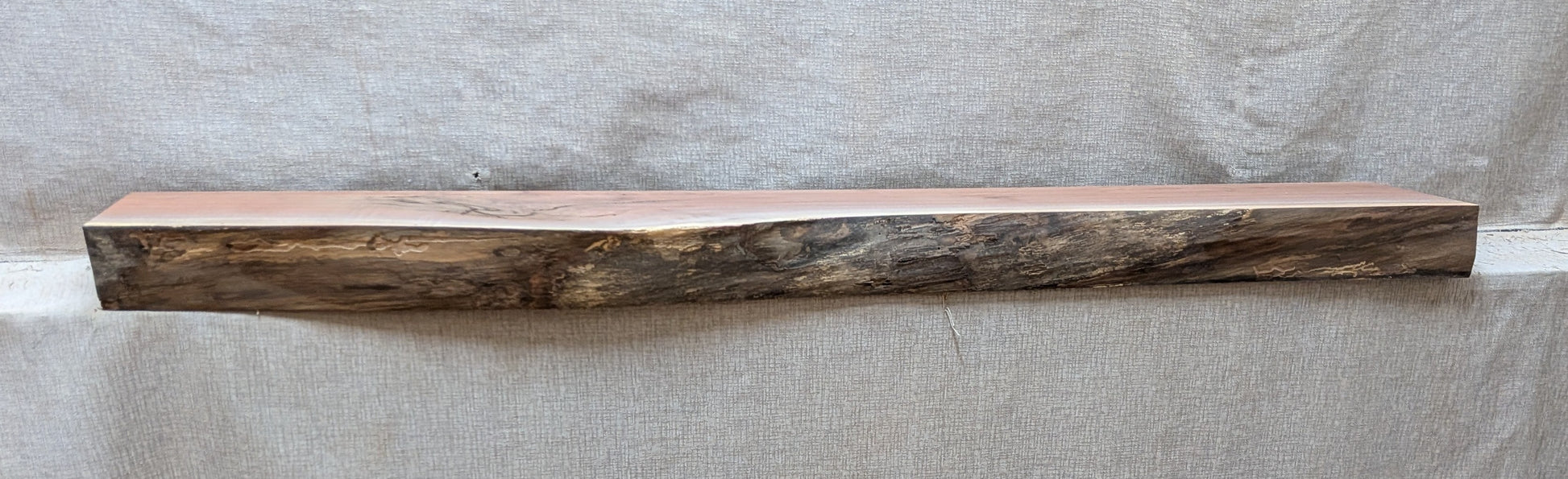 Mixed brown colors on an irregular shaped face which shows wormy character and machine scars. Mixed dark and light brown color on top and bottom with knots and splits.