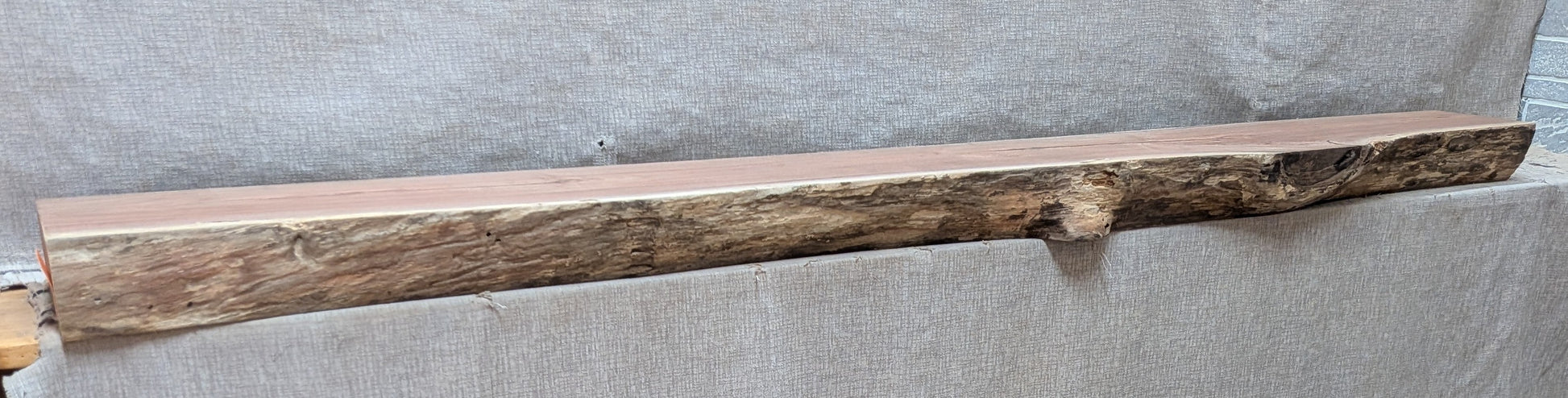 Mixed brown colors on an irregular shaped face which shows cut off branch and machine scars. Mixed dark and light brown color on top and bottom with knots and splits.