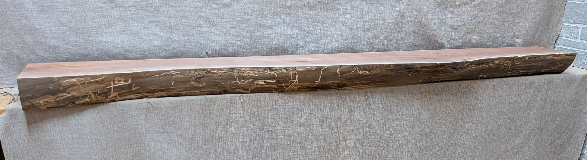 Mixed brown colors on an irregular shaped face which shows wormy character and bark remnants. Mixed dark and light brown color on top and bottom with knots, splits, and bark seams.
