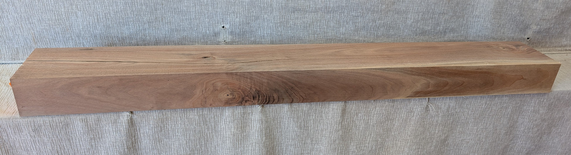 Mixed dark and light brown color on face which shows variable grain and knots. Mostly dark brown color on top and bottom with knots and splits.