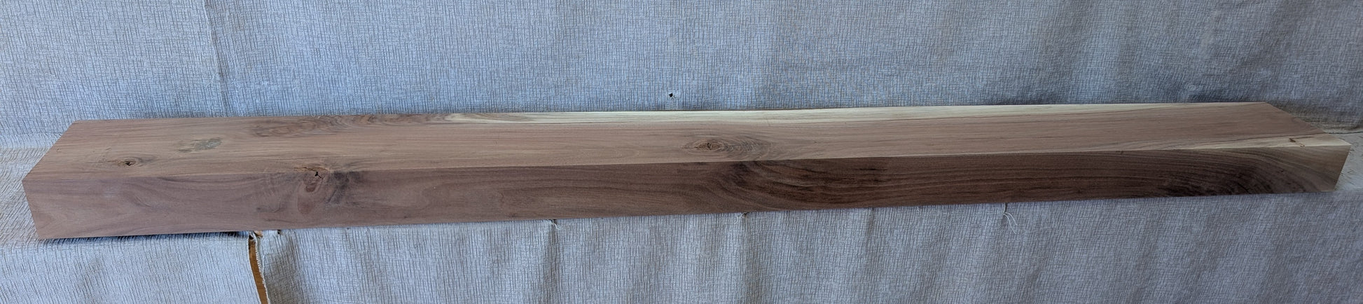 Mixed dark and light brown color on face which shows variable grain and knots. Mostly dark brown color on top and bottom with knots and splits.